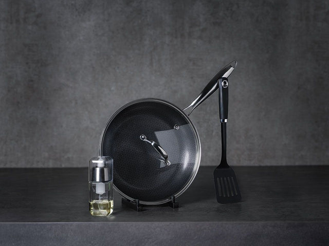 Ciò che distingue davvero i nostri prodotti dalle vostre normali pentole e padelle è il processo unico di incisione laser che crea il design brevettato a esagoni di ONYX COOKWARE™. Questo processo unico crea una serie di picchi e valli sul pentolame. Nella valle si trova il materiale antiaderente, garantendo la funzionalità antiaderente e una facile pulizia. Uno dei picchi è in acciaio inossidabile, che garantisce durata, una perfetta doratura sulla carne e la possibilità di utilizzare utensili e attrezzi in metallo. Ecco perché chiamiamo le nostre pentole e padelle "ibride". Offrono il meglio di due mondi: la funzionalità antiaderente che tutti desideriamo nelle nostre pentole e la durata di una padella professionale in acciaio inossidabile o ghisa.