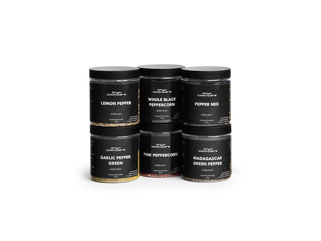 ONYX COOKWARE™ PEPPER COMPLETE offre una sinfonia di sapori che si adattano a gusti diversi e preferenze culinarie. Puoi facilmente scegliere tra sei diverse tipologie di miscele di pepe, tutte pensate per soddisfare i tuoi desideri. Qualunque sia il tuo umore per il pepe, siamo pronti a farti assaporare.