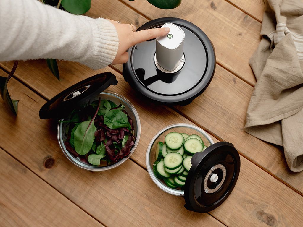 Il contenitore sottovuoto mantiene freschi i tuoi cibi fino a cinque volte più a lungo. Usa la pompa sottovuoto per aspirare l'aria: in pochi secondi, il tuo cibo sarà conservato e pronto per essere utilizzato quando ti servirà. Grazie al suo design intelligente, è possibile impilare i contenitori, liberando spazio nel frigo per gli altri cibi. Sul coperchio c'è un orologio manuale per impostare la data di conservazione, così puoi sapere facilmente per quanto tempo il tuo cibo è rimasto sottovuoto.