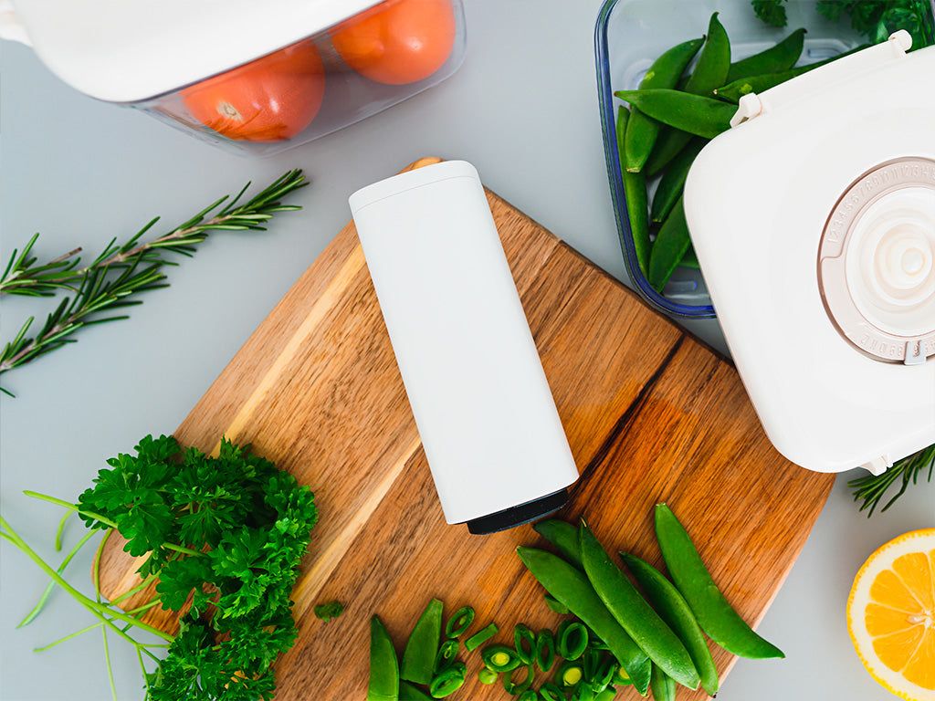 Abbiamo preso il tuo normale contenitore per cibi e gli abbiamo aggiunto una valvola per il sottovuoto. Poi abbiamo progettato una piccola e comoda pompa sottovuoto alimentata a batteria, che si adatta perfettamente alla valvola. Grazie alle dimensioni ridotte e (secondo noi) al design elegante, non sfigura affatto sulla mensola dei condimenti o in un altro posto facilmente accessibile in qualsiasi momento.